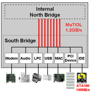Именно эту идею и переделали на свой лад разработчики компании SiS, начав встраивать MuTIOL в свои чипсеты. Итак, для каждого встроенного Master устройства, включая два канала IDE, два канала USB, MAC контролер и AC'97 звук/модем, выделяется собственный поток, соединяющий устройство с северным мостом. Дополнительно к этому, отдельный поток выделяется под внешние PCI устройства. В результате, теоретическая пропускная способность при пиковой нагрузке составляет именно те 1.2 ГБ/сек, указанные в спецификации.