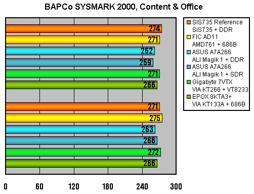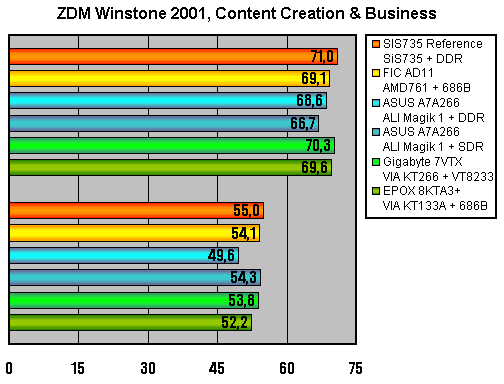Нет, все-таки загадочный чипсет этот SiS735 :) Однако если на время "забыть" про диаграммы Quake III, то результаты SYSmark 2000 и ZDM Winstone 2001 демонстрируют в принципе сходную картину — в первом тесте SiS735 и AMD760 лидируют в общем зачете, попеременно незначительно уступая друг другу в отдельных номинациях Office Productivity и Internet Content Creation, а в Winstone 2001 SiS735 даже слегка вырвался вперед в обеих номинациях.