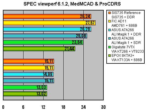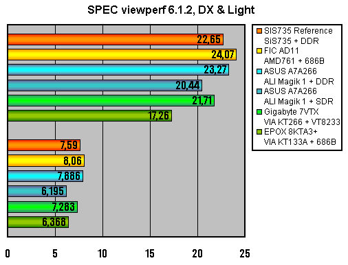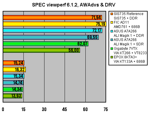 SPECviewperf, как мы уже знаем по предыдущим тестам, подсистему памяти нагружает очень хорошо, выпячивая ее недостатки самым что ни на есть жестким образом. И здесь первым оказался все-таки AMD760. Правда, чипсет SiS оказался… вторым! — опередив как VIA KT266/KT133A, так и ALi MAGiK 1. И, судя по всему, мы все-таки нашли причину, по которой все происходит именно так, как происходит. Оставайтесь, как говорится, с нами :)