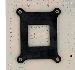 На оборотной стороне платы смонтирована защитная пластина для предотвращения изгиба текстолита при установке массивных процессорных кулеров.