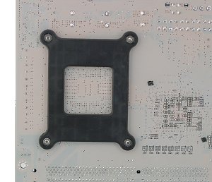 На оборотной стороне платы смонтирована защитная пластина для предотвращения изгиба текстолита при установке массивных процессорных кулеров.