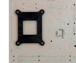 На оборотной стороне платы смонтирована защитная пластина для предотвращения изгиба текстолита при установке массивных процессорных кулеров.