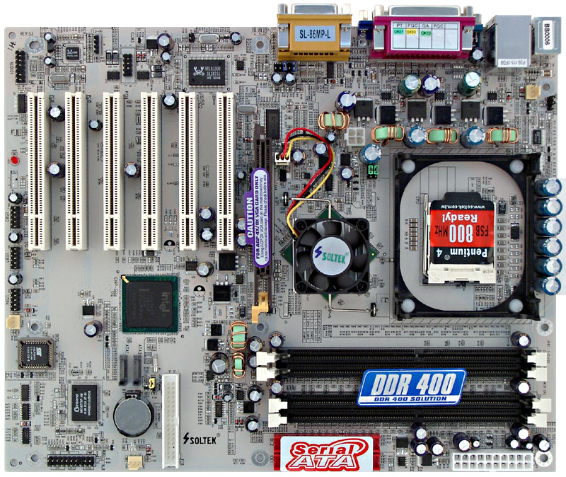 Плата полностью аналогична другой модели компании Soltek 86SPE-L, за исключением, разумеется, примененного чипсета и вытекающего из этого факта наличия встроенного видеоадаптера.