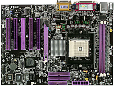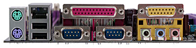 В остальном же разводка платы вполне привычна, и из недостатков ее можно отметить разве что неудобное для подключения кабелей расположение ряда разъемов вдоль левого края. Доступ к некоторым из имеющихся перемычек может быть затруднен при установке платы в корпус, краткое описание их функциональности приведено на текстолите платы. В трехканальном импульсном стабилизаторе напряжения питания процессора применены 6 конденсаторов по 3300 мкФ и 3 по 1500 мкФ. Также на плате находятся стабилизаторы напряжения шины AGP (включающий 2 конденсатора по 1000 мкФ) и памяти (3 по 1500 мкФ и несколько менее емких; усилен применением индуктивных элементов).