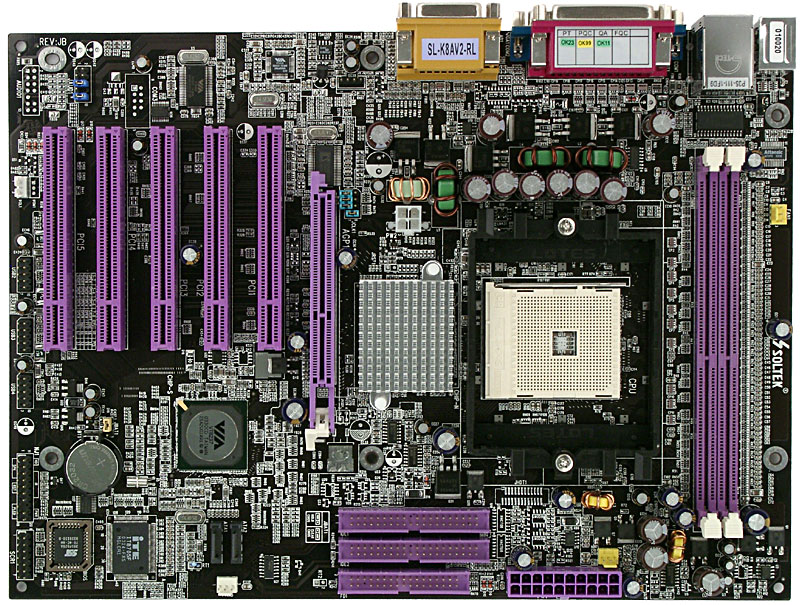 В качестве «пробы пера» под Athlon 64 Soltek предлагает серию плат бюджетного уровня. Конечно, современные чипсеты даже и без применения внешних контроллеров обеспечивают очень неплохой уровень функциональности, но все же, учитывая нынешнюю стоимость 64-битных процессоров AMD, можно, казалось бы, рассчитывать и на более высокий уровень плат. Из ряда прочих моделей K8AV2-RL выделяется своим дизайном: как приятным цветовым решением, так и поворотом на 90° процессорного сокета и соответствующим перемещением разъемов модулей памяти на текстолите.