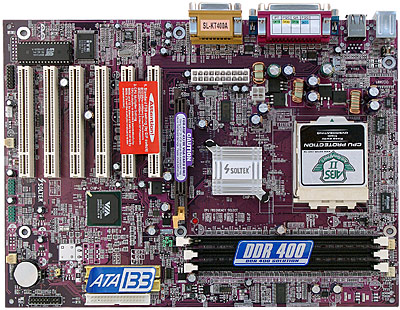 Кроме собственно модели KT400A на базе этой же PCB выпускается только одна плата на чипсете VIA KT400A KT400A-L, отличающаяся от побывавшей у нас наличием интегрированного 10/100 Мбит Ethernet-контроллера. Однако нам кажется уместным упомянуть еще несколько продуктов, так или иначе связанных с Soltek KT400A. Во-первых, это плата KT400A-C, использующая в точности такую же комбинацию северного и южного мостов (KT400A + VT8235), но базирующаяся на другой PCB и имеющая всего 5 слотов PCI, 2 слота DIMM и 2-канальный AC’97-кодек это продукт самого нижнего ценового уровня. Кроме того, интересно, что разведенные, но не распаянные ни на KT400A, ни на KT400A-L разъемы Serial ATA вообще не должны присутствовать в платах на чипсете VIA KT400A, ибо данный чипсет «по классике» оснащается южным мостом VT8235. Зачем же они разведены на этой PCB? А все дело в том, что она же используется для плат на базе VIA KT600! И вот на них-то (KT600-R/RL) мы уже можем видеть распаянные разъемы Serial ATA, так как там используется поддерживающий данную функцию южный мост VT8237, а на KT600/-L эти разъемы вновь не распаяны, по прежней причине.
