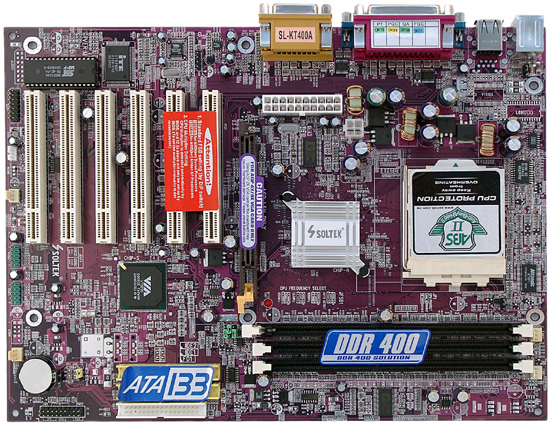 Разводка платы не очень удобна (честно говоря, платы от Soltek с удобной разводкой нам встречались редко): разъемы IDE и FDD расположены позади слотов PCI, а звуковые разъемы перед ними, также не лучшим образом для подключения расположен ряд разъемов вдоль левого края платы. Доступ к некоторым из имеющихся перемычек может быть затруднен при установке платы в корпус, краткое описание их функциональности приведено на текстолите платы. В двухканальном импульсном стабилизаторе напряжения питания процессора применены 6 конденсаторов по 2200 мкФ и 2 по 1500 мкФ. Также на плате находятся стабилизаторы напряжения шины AGP (включающий 3 конденсатора по 1000 мкФ) и памяти (3 по 1000 мкФ и несколько менее емких). Наличие напряжения +5 В индицируется красным светодиодом на плате. Разведены, но не распаяны на плате: разъем фронтальных аудиовыходов, один разъем для подключения планки с портами USB и разъемы SATA, сетевой PHY-контроллер. Размеры платы 305х225 мм («зауженный ATX», крепление шестью винтами, передний край платы будет провисать без дополнительной фиксации).