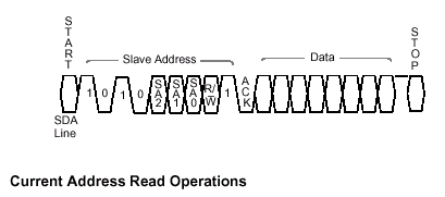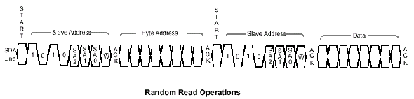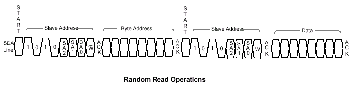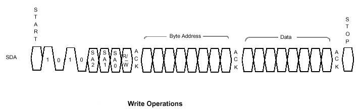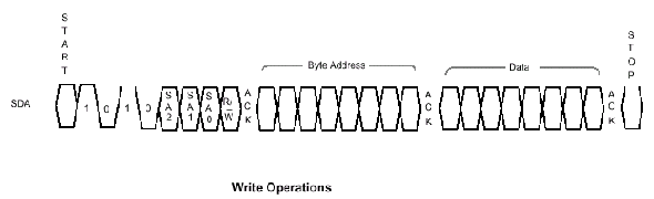 Операции записи (Write Operations) данных состоят из двух фаз: запись байта (Byte Write) и подтверждения опроса (Acknowledge Polling). После приема подчиненным устройством адреса байта отрабатывается подтверждающий ответ и выполняется цикл ожидания следующего байта данных, который также отрабатывается сигналом подтверждения (ACK). В конце передачи управляющее устройство прекращает посылки данных выставлением на шину команды STOP и подчиненное устройство входит в цикл внутренней записи, в течение которого входы микросхемы EEPROM отключаются и приемники сигнала не реагируют ни на какие запросы от хозяина шины (передающего устройства).