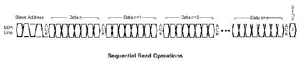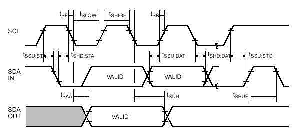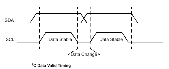 В течение выполнения фазы передачи данных микросхема EEPROM согласует посылки по линии SDA с каждым фронтом системного синхросигнала SCL. Для согласованной работы устройств, сигналы на шине данных должны оставаться в активном состоянии в течение всей длительности импульса системного синхросигнала, включая время нарастания/спада (фронта/среза импульса) и изменять текущее состояние только в промежутке между срезом предыдущего и фронтом следующего синхросигнала.