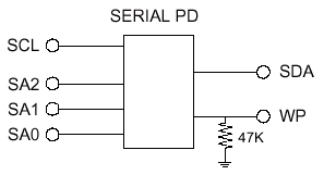 Считывание/запись данных из/в EEPROM производится по линии ввода/вывода SDA при помощи сигнала SCL (входящий сигнал синхронизации чтения/записи данных) совместно с сигналами адреса SA[2:0], предусмотренных цоколевкой модуля. Система синхронизируется с микросхемой SPD на частоте 80kHz.