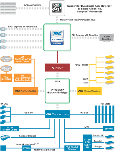 На рынке чипсетов под AMD64 довольно долго царило затишье. VIA предлагала, по сути, неизменный со времен старта этой платформы чипсет K8T800 (в модификации Pro, с повышенной пропускной способностью HyperTransport), а NVIDIA за полтора года лишь «провела работу над ошибками», заменив более интересной серией nForce3 250 совсем уж аскетичные nForce3 150. Выход на «рынок вообще» технологии PCI Express и выход на рынок продуктов под AMD64 компании ATI с чипсетами Xpress 200/P неизбежно привел к покорению новых рубежей. Сегодня мы представляем вашему вниманию первый ход известного производителя компании VIA Technologies.