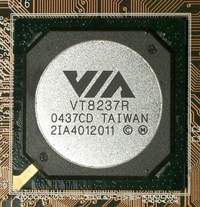 Южному мосту VIA VT8237 на момент написания этой статьи исполнилось уже полтора года, в течение которых он является бессменной парой для всех новых северных мостов компании. И если на момент анонса это был, пожалуй, самый функциональный продукт на рынке, то сейчас он ничем не выделяется среди конкурирующих решений. За прошедшее время VIA успела отказаться от выпуска VT8239, предпочтя ориентироваться сразу на VT8251, но последний все еще находится в стадии доводки, его массовое производство ожидается лишь во втором квартале 2005-го. Так что хотя при анонсе официальной парой для K8T890 назывался VT8251 (на сайте VIA до сих пор доступна соответствующая иллюстрация), придется, видимо, до выхода K8T890 Pro обходиться старыми резервами. Между тем, одно изменение на этом фронте все-таки имело место: из-за проблем с зарегистрированными торговыми именами компания изменила маркировку южного моста на VT8237R (как видно на фотографии ниже). Однако это все тот же VT8237, не сомневайтесь.