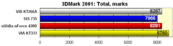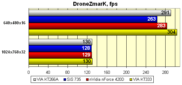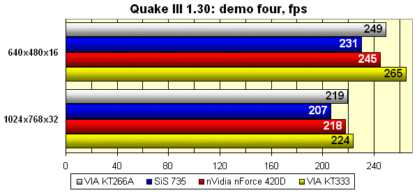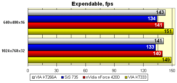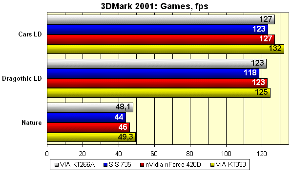 Более медленная память у SiS 735 усугубляется плохой работой с AGP, так что в играх он новому чипсету VIA не соперник  отставание доходит до 15% в зависимости от использованных разрешений и требовательности теста к ресурсам. nForce в играх выглядит поприятнее, но все равно не дотягивает даже до результатов KT266A. Последний сражается достойнее прочих, но и ему KT333 «отгружает» до 56% в каждой тестовой игре. Расклад по разрешениям в конкретных приложениях вроде бы ясен из диаграмм и не требует особых комментариев.