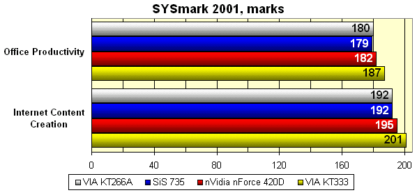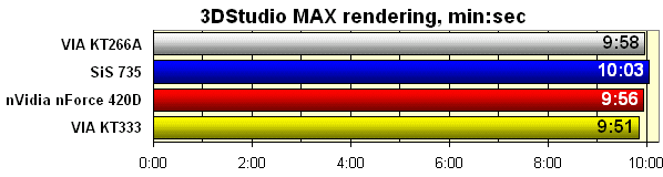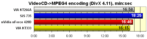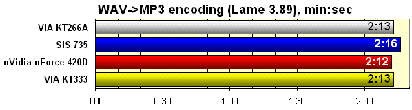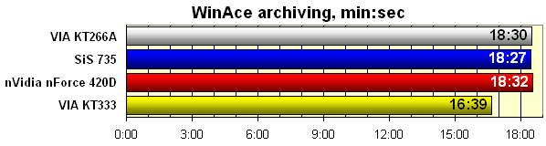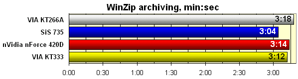 При кодировании MP3 никакой разницы между чипсетами нет  очевидно, скорость выполнения операции упирается либо в дисковую подсистему, либо в производительность процессора, поэтому использование более быстрой памяти не дает существенного прироста. При архивировании же с помощью WinZip некоторый разрыв проглядывает, причем, несмотря на ускорение KT333 на 3% по сравнению с предшественником, лидером по-прежнему остается чипсет SiS. Это может свидетельствовать о быстроте контроллера IDE в SiS 735, но, с другой стороны, абсолютная разница настолько мала, что вполне вписывается в возможную погрешность измерений.