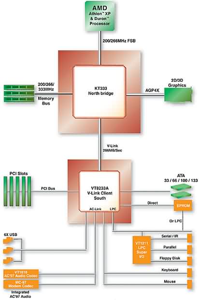 Архитектурно новый чипсет не отличается от предшественника  VIA KT266A (да и вообще эти чипсеты почти ничем не отличаются): все те же два моста, связанные специальной высокоскоростной шиной, плюс отвечающий за работу с флоппи-дисководом, COM-, LPT-портами и пр. чип LPC Super I/O.