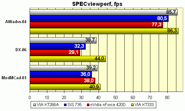 В OpenGL-тестах пакета SPECviewperf у VIA и так были показатели повыше, а теперь они улучшены на 14% в наиболее чувствительном к пропускной способности памяти DX-06. В остальных тестах выигрыш поскромнее, но «свои» 45% новый чипсет дает. Кроме, конечно, AWadvs-04, где результат почти полностью зависит от скорости текстурирования видеокарты, и который, кстати, четко указывает на слабое место нынешних чипсетов SiS и nVidia  скорость работы AGP (в том числе, возможно, огрехи в реализации GART-драйвера): их отставание по всему набору варьируется от 7 до 50%(!!!).