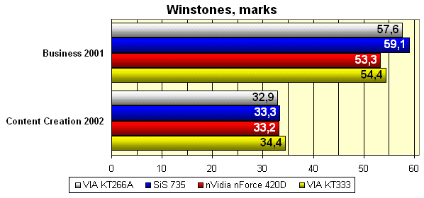 Если, как обычно, отбросить результат Business Winstone, то картина похожая и вполне предсказуемая: 34% превосходства нового чипсета. Больше ждать и не следует, так как тесты в значительной степени завязаны на производительность дисковой подсистемы. Кстати, лидерство SiS735 в Business Winstone может косвенно свидетельствовать о все той же лучшей отлаженности работы с жестким диском, если, конечно, вообще принимать результаты этого теста во внимание. Любопытно отметить, что в рекламных материалах VIA показатели ее чипсетов в SYSmark 2001 ICC соотносятся так: 196/201. Действительность перекрывает самые смелые ожидания! :)