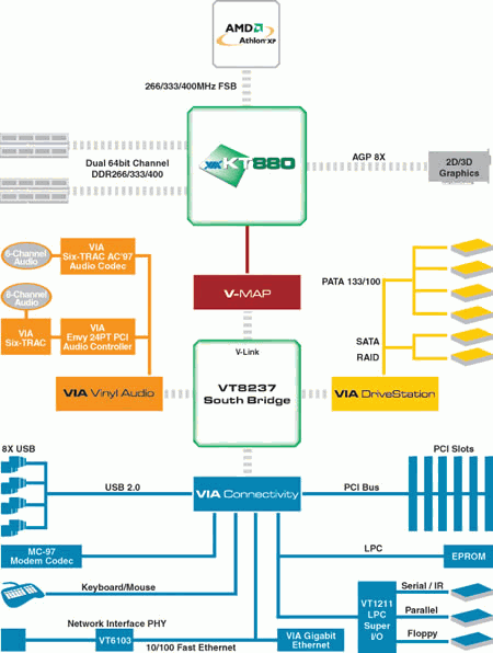 Двухканальный контроллер памяти VIA уже сделала, и очень неплохой (PT880), остальная функциональность платформы отточена на поколениях чипсетов серии KT, включая полностью совпадающий по возможностям (кроме «двухканалки») KT600. Очевидно, что ничего непривычного мы на блок-схеме новичка не увидим: