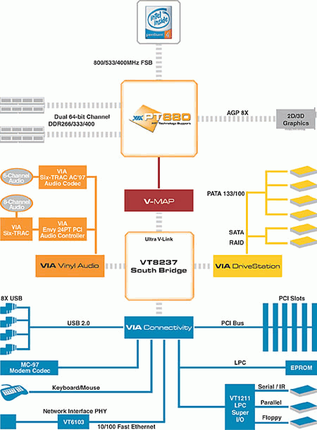 PT880 первый двухканальный чипсет VIA вообще (KT880 объявлен, но плат на нем, очевидно, придется подождать). Его предшественник, PT800, не поставил рекордов скорости, но приятно удивил нас своей функциональностью, находящейся на уровне (и даже выше) топовых продуктов конкурентов. В этом очень неплохом чипсете VIA переработан, по сути, только контроллер памяти, так что функциональная блок-схема новичка должна показаться вам знакомой: