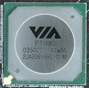 Отличия от решений конкурентов обнаруживаются только с применением сильной лупы: контроллер памяти PT800/880 поддерживает вдвое больше памяти и модули с ECC. Опять же, интегрированных контроллеров FireWire и Gigabit Ethernet у чипсета VIA нет, а поддержка PCI Express и DDR2 появится лишь в следующем продукте компании, PT890. Единственное функциональное отличие PT880 от PT800 (кроме количества каналов контроллера памяти) состоит в применении у более нового из них ускоренной вдвое шины Ultra V-Link до южного моста чипсета. Зачем увеличивать пропускную способность этой шины до ~1 ГБ/с при том же южном мосте остается загадкой.