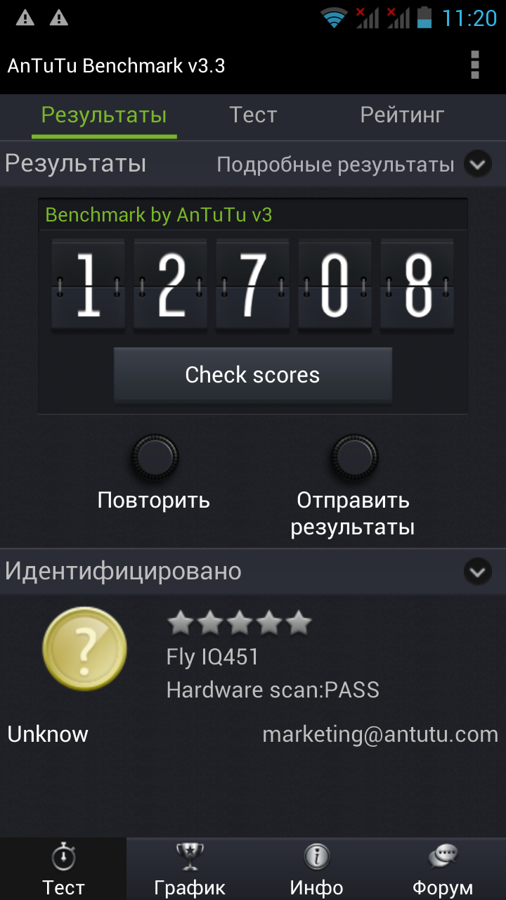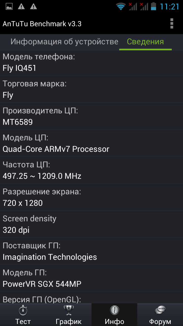 В заключение еще один традиционный тест в программе GLBenchmark. Как видно по снимку экрана, время работы Fly IQ451 от батареи в нем составило 3 часа, что, опять же, меньше, чем у смартфонов на базе MT6577 (однако у них и игровое разрешение было, как правило, ниже).