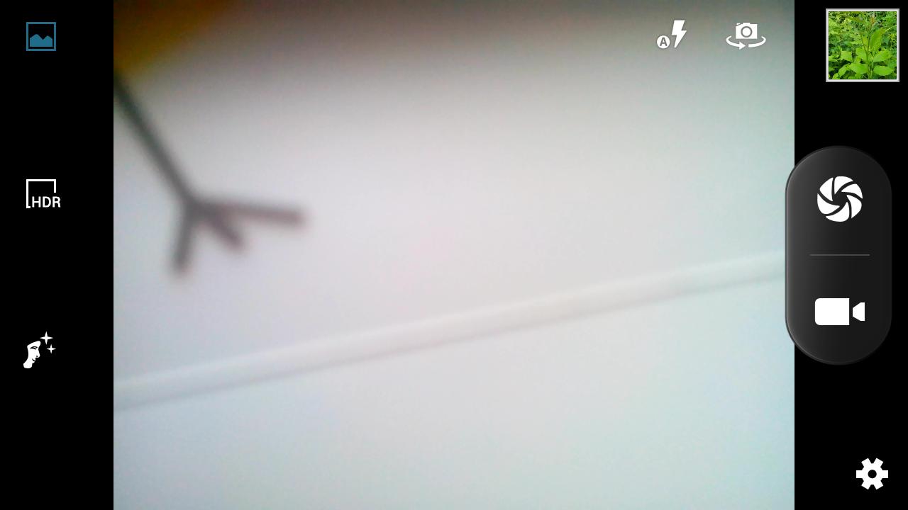 Программа управления встроенными во Fly IQ451 камерами, главной с разрешением 8 мегапикселей и дополнительной с матрицей в 2 мегапикселя, встроена в операционную систему и имеет стандартный внешний вид. По правому краю экрана сгруппированы клавиши начала фото- и видеосъемки (они самые крупные), иконка меню настроек, значок галереи, иконки управления вспышкой и переключения между основной и дополнительной камерами. У левого края экрана находятся значки различных режимов съемки: обычная, HDR и в условиях плохого внешнего освещения.