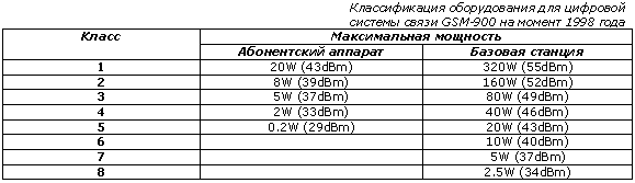 Максимальная мощность излучения подвижного аппарата в зависимости от его назначения (автомобильный постоянный или переносный, носимый или карманный) может изменяться в пределах 0.8-20 Вт (соответственно 29-43 дБм). В качестве примера в таблице приводятся классы станций и абонентских устройств по применяемой мощности, принятые в системе GSM-900.