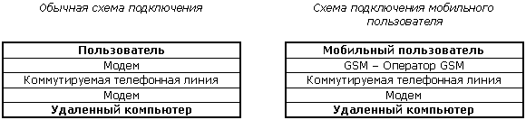 Слой соединения GSM непосредственно с обычной телефонной сетью поддерживает протоколы передачи данных в V.21, V.22, V.22bis, V.23, V.26ter, V.32 и протокол коррекции ошибок и сжатия данных MNP5. Поскольку данные по сети GSM передаются в цифровом виде, а модем на другом конце обычной коммутируемой линии работает только с аналоговыми сигналами, адаптер, рассматриваемый в первом примере, формирует такую последовательность данных, которая воспринимается модемом как обычные телефонные сигналы, в том числе несущая сигнала "занято" и т.д. Как правило, адаптер требует стандартных модемных установок: 8N1, скорость 2400, 4800 или 9600 bps. В случае же применения ИК-порта такие "преобразования" происходят уже внутри самой трубки.