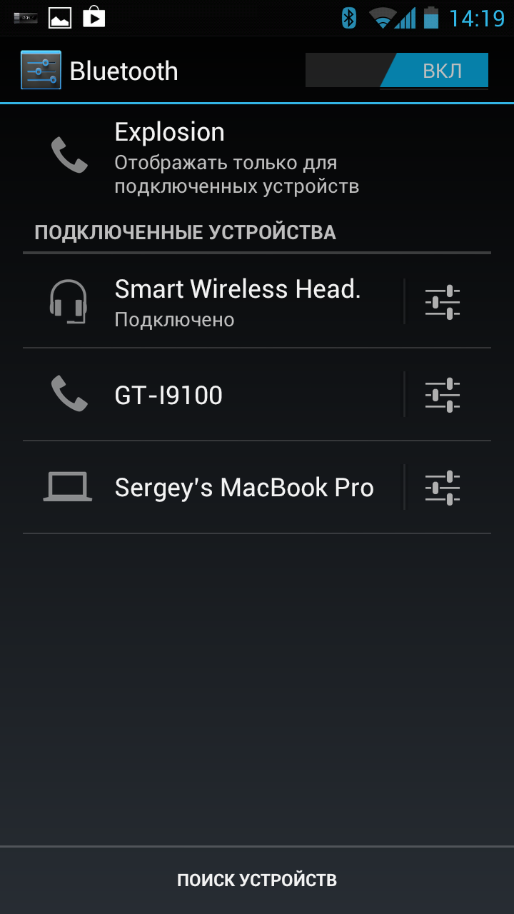 Передача файлов между Highscreen Explosion и MacBook Pro Mid 2009 через модуль Bluetooth завершилась успешно, скорость обмена данными составила 1,3 Мбит/с. В Highscreen Explosion поддерживается множество профилей работы этого модуля связи; ключевые из них: работа в качестве модема, передача файлов, подключение стереогарнитуры. Использовать герой обзора в качестве Bluetooth-модема, однако, не получилось: ни MacBook, ни Samsung Galaxy S 2 не смогли выйти в интернет посредством Highscreen Explosion. Впрочем, герой обзора может раздавать трафик с помощью модуля Wi-Fi.