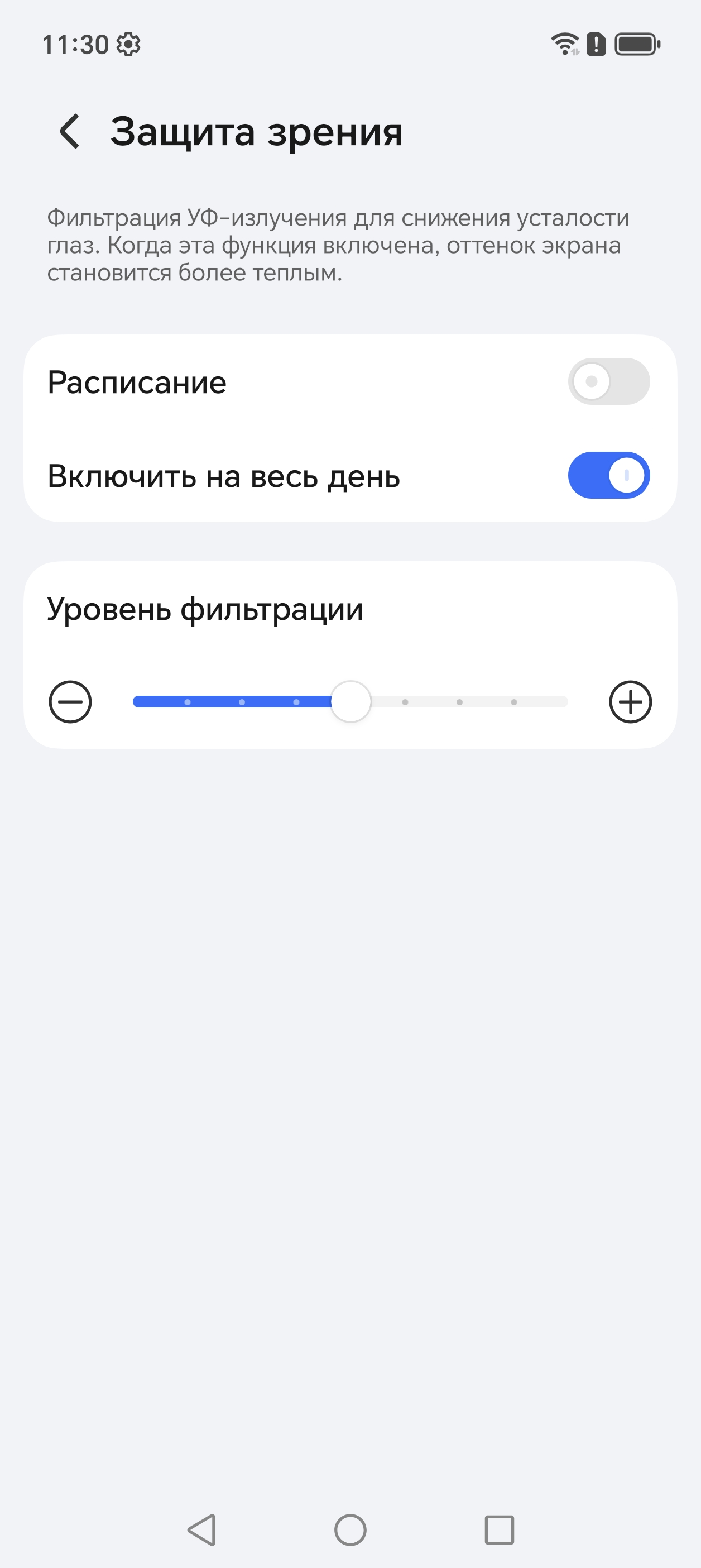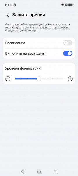 В описании режима Защита зрения приведена дезинформация про УФ-излучение (его нет — см. спектры) и усталость глаз. В принципе, яркий свет может приводить к нарушению суточного (циркадного) ритма (см. статью про iPad Pro с дисплеем 9,7 дюйма), но все решается снижением яркости до низкого, но еще комфортного уровня, а искажать цветовой баланс, уменьшая вклад синего, нет абсолютно никакого смысла.