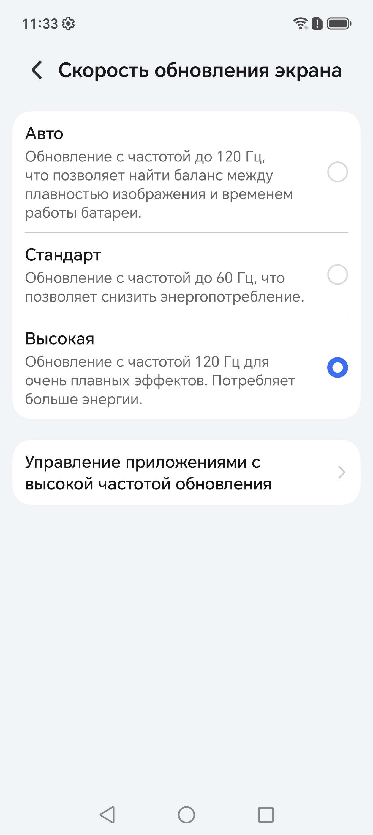 В настройках экрана можно включить режим с повышенной до 120 Гц частотой обновления.