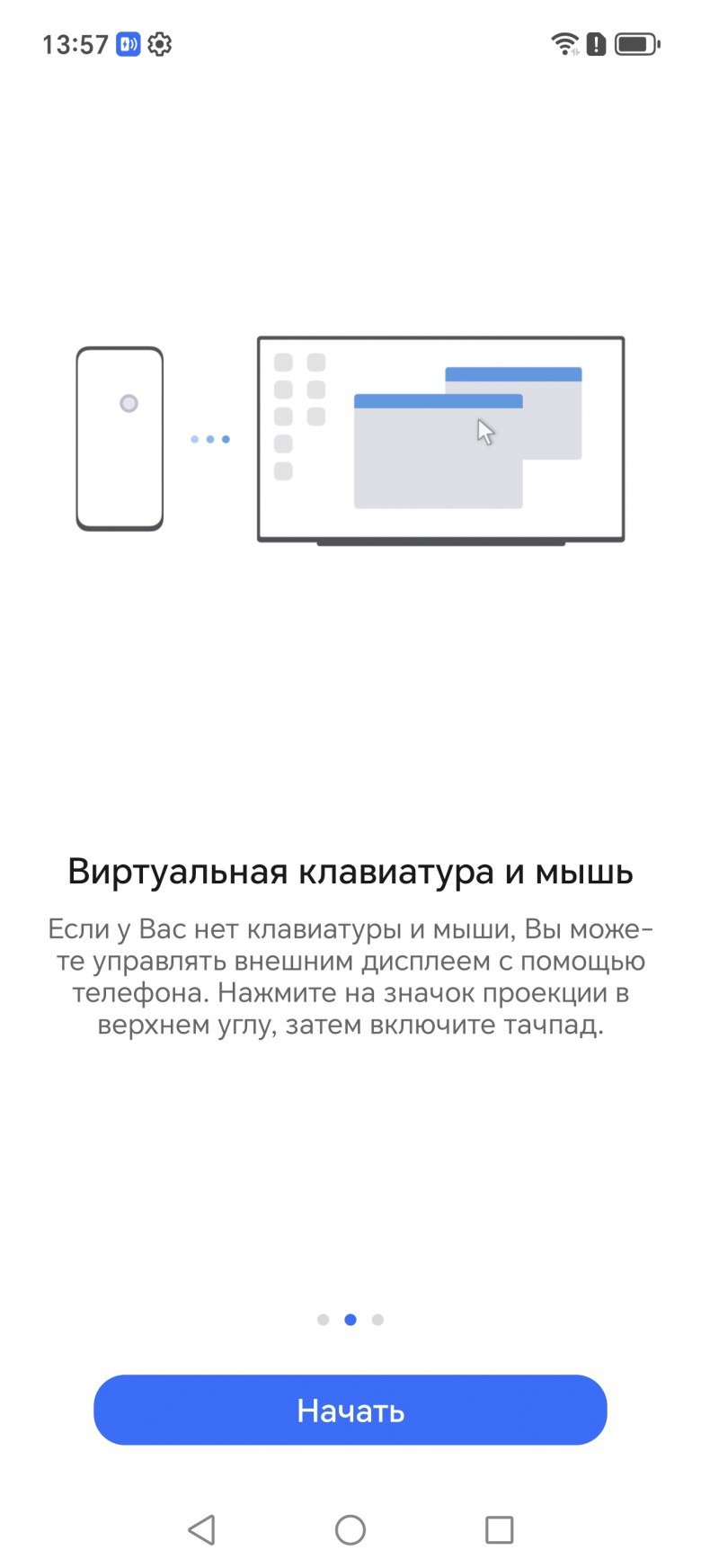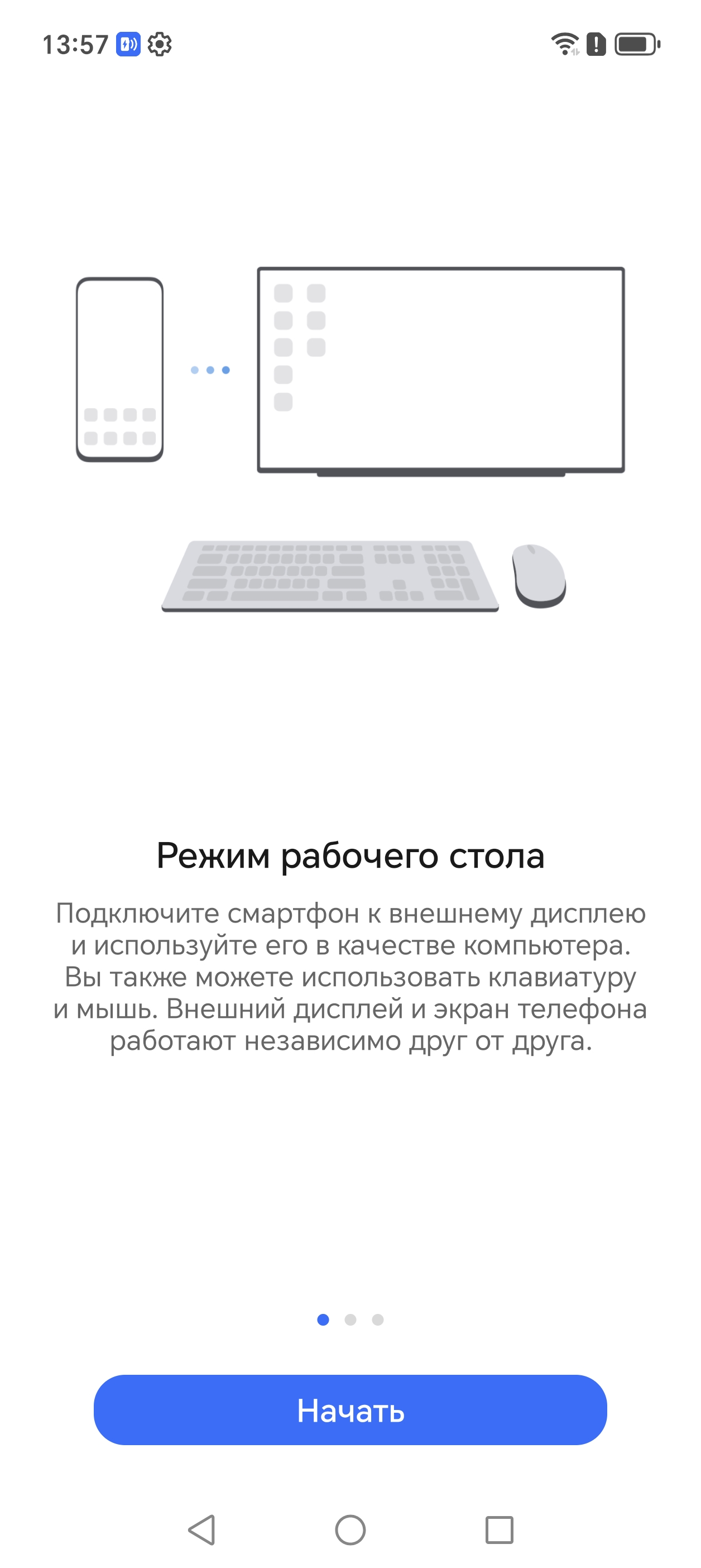 Для зарядки смартфона к адаптеру/док-станции потребуется подключить зарядное устройство, а мониторы со входом USB Type-C обычно сами подают питание на смартфон. В режиме рабочего стола на внешнем мониторе можно параллельно работать на самом смартфоне, то есть получается два рабочих стола одновременно, но вывод видео в режиме аппаратного декодирования осуществляется только на один экран, также одна и та же программа не может работать и там, и там.