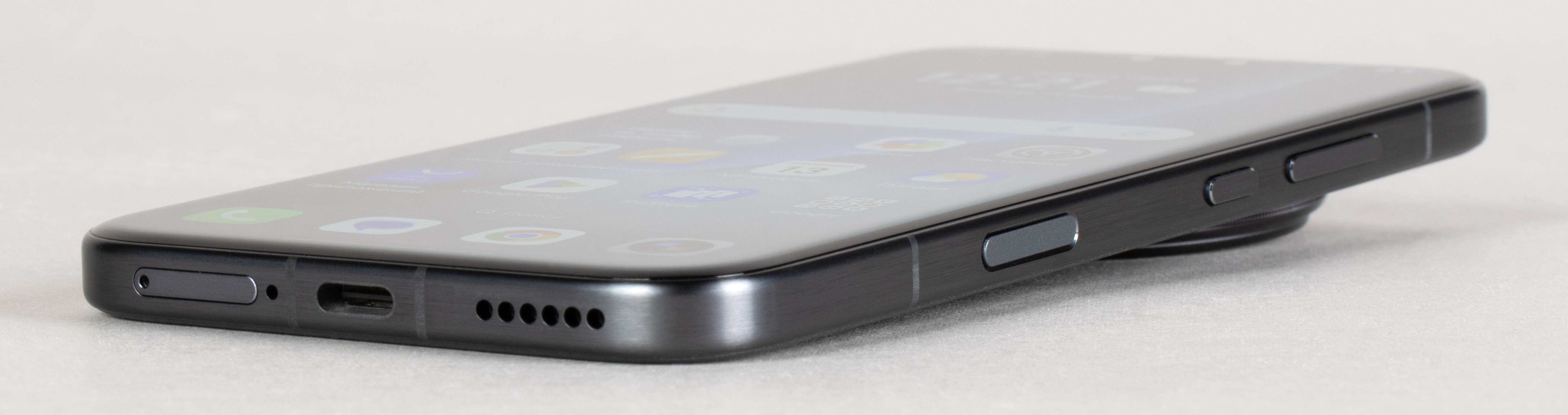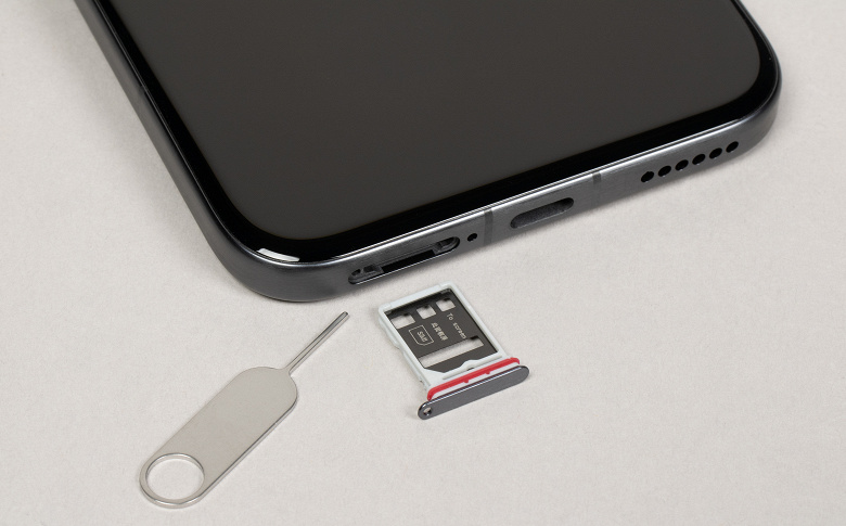 На нижнем торце установлены динамик, разъем USB Type-C и микрофон. В выдвижной лоток можно установить две карты Nano-SIM, для карты памяти microSD разъема не предусмотрено.