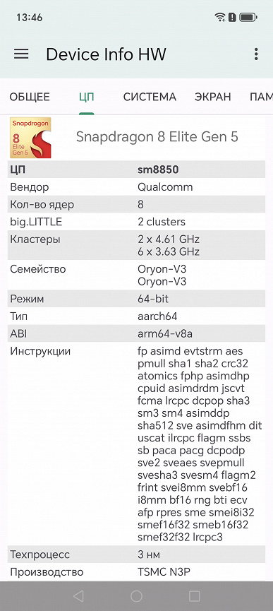 - SoC Qualcomm Snapdragon 8 Elite Gen5, 8 процессорных ядер (2×Oryon V3 Phoenix L @4,6 ГГц + 6×Oryon V3 Phoenix M @3,62 ГГц)
