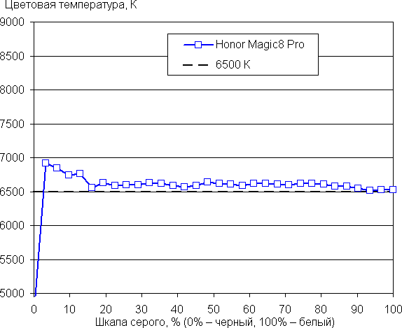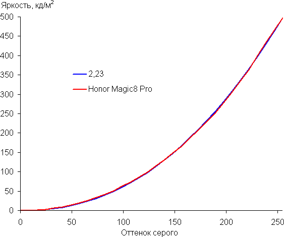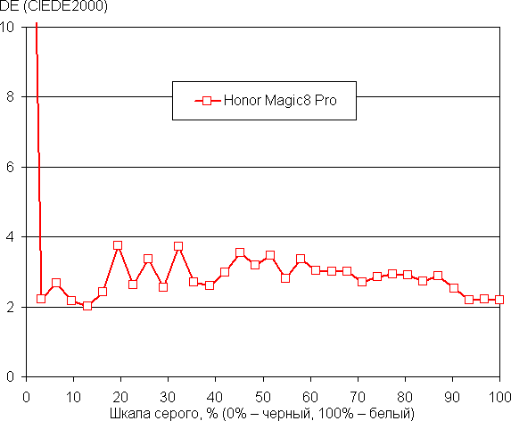 Напомним, что в случае OLED-экранов яркость фрагментов изображения динамично меняется в соответствии с характером выводимого изображения — чуть уменьшается для светлых в целом изображений. В итоге полученная зависимость яркости от оттенка (гамма-кривая), скорее всего, не соответствует гамма-кривой статичного изображения, так как измерения проводились при последовательном выводе оттенков серого почти на весь экран.
