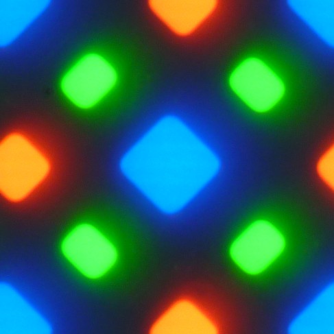 В этом экране используется матрица AMOLED — активная матрица на органических светодиодах. Полноцветное изображение создается с помощью субпикселей трех цветов — красного (R), зеленого (G) и синего (B), но красных и синих субпикселей в два раза меньше, что можно обозначить как RGBG. Это подтверждается фрагментом микрофотографии: