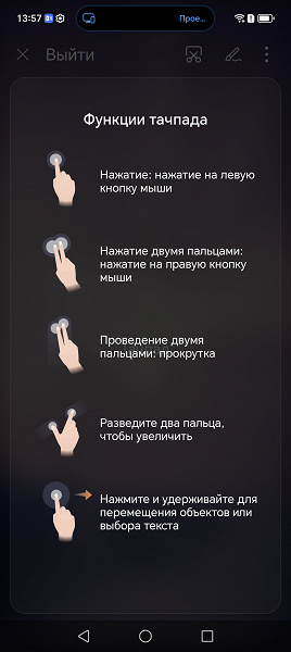 При этом экран смартфона может использоваться в качестве сенсорной панели координатного ввода, или быть планшетом для рисования поверх рабочего стола, или работать как обычно, вторым рабочим столом небольшого размера.