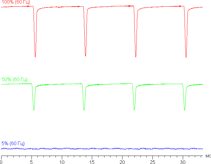 На любом уровне яркости присутствует значимая модуляция с частотой 120 Гц. На рисунках ниже приведены зависимости яркости (вертикальная ось) от времени (горизонтальная ось) для нескольких значений настройки яркости:
