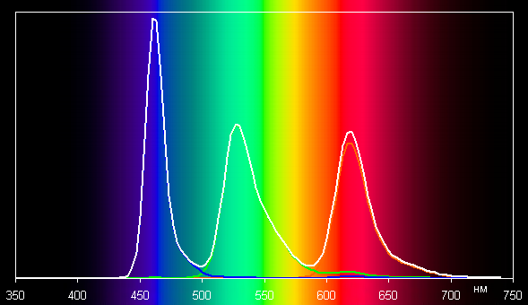 В первом случае спектры компонент (то есть спектры чистых красного, зеленого и синего цветов) очень хорошо разделены: