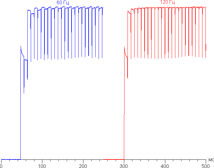 Переключение состояния элементов матрицы выполняется практически мгновенно, но на фронте включения может присутствовать ступенька, ширина которой зависит от текущей частоты обновления. Для частоты обновления в 60 Гц это примерно 17 мс, для 120 Гц — примерно 8 мс. Например, так выглядит зависимость яркости (вертикальная ось) от времени (горизонтальная ось) при переходе от черного к белому (режим 60 Гц и 120 Гц):