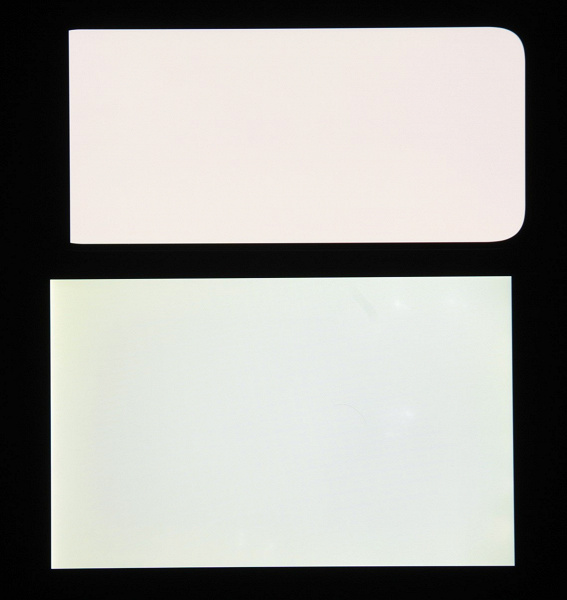 Экран характеризуется великолепными углами обзора. Яркость под углом у обоих экранов заметно уменьшается (если сравнивать с Nexus 7), но в случае смартфона падение яркости выражено гораздо меньше. В итоге при формально одинаковой яркости экран этого смартфона визуально выглядит гораздо более ярким (в сравнении с ЖК-экранами), так как на экран мобильного устройства часто приходится смотреть как минимум под небольшим углом. Правда, у смартфона белый цвет при отклонении на большие углы приобретает легкий сине-зеленый оттенок, но черный цвет остается просто черным под любыми углами. Он настолько черный, что параметр контрастности в данном случае неприменим. Для сравнения приведем фотографии, на которых на экраны смартфона и второго участника сравнения выведены одинаковые изображения, при этом яркость экранов изначально установлена примерно на 200 кд/м², а цветовой баланс на фотоаппарате принудительно переключен на 6500 К.