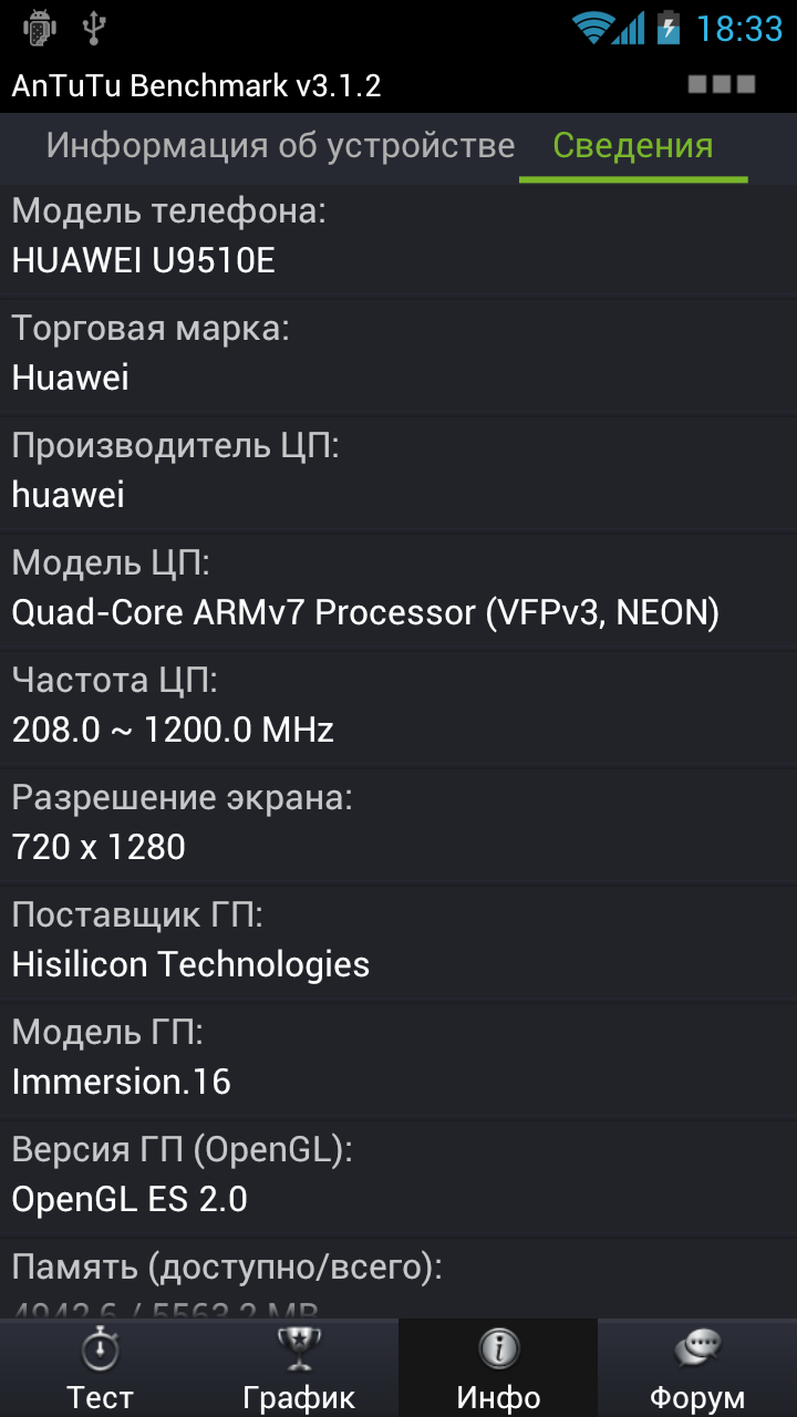 Настал черед ознакомиться с возможностями не самой распространенной платформы HiSilicon K3V2 Hi3620, разработанной одним из подразделений Huawei и используемой в устройствах этой компании, в том числе в Huawei Ascend D1 Quad. Необходимо напомнить, что в K3V2 входят четыре ядра ARM Cortex-A9 способные работать на частотах вплоть до 1,4 ГГц, однако у героя обзора максимальная частота снижена до 1,2 ГГц (у смартфонов Huawei Ascend D1 Quad XL находящихся в продаже процессор работает с максимальной частотой 1,4 ГГц). В состав однокристальной системы HiSilicon также входят 16 графических ядер Vivante, сгруппированых в два чипа GC4000. Объем оперативной памяти в Huawei Ascend D1 Quad XL равен 1 ГБ.