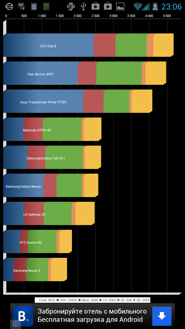 Герой обзора вступил в борьбу с прошлогодним флагманом Samsung и выступил с ним на равных, несмотря даже на пониженную частоту работы вычислительных ядер. Где-то Huawei Ascend D1 Quad XL уступил представителю третьего поколения смартфонов Galaxy, кое-где его обошел. Особенно впечатляющим выглядит отрыв в AnTuTu Benchmark 3.1.