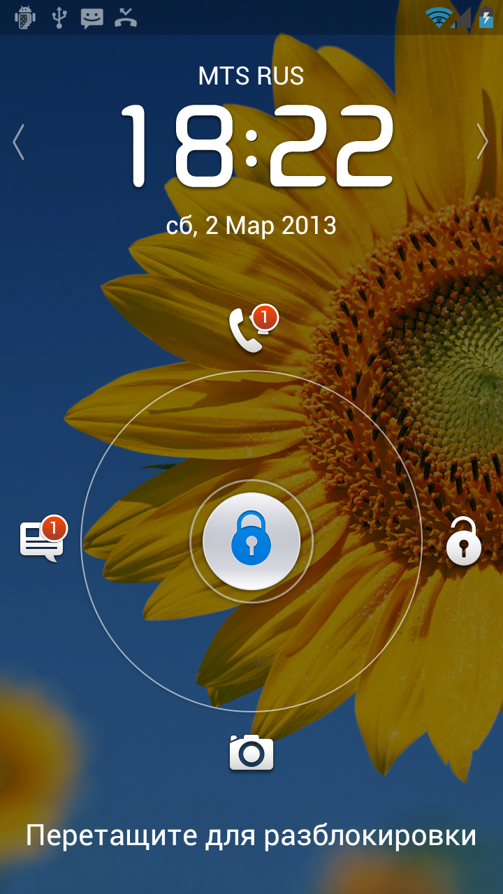 Поверх системы в Huawei Ascend D1 Quad XL установлена фирменная оболочка, которую условно можно назвать 2D/3D Home. Несмотря на очевидную направленность на добавление спецэффектов к стандартным действиям пользователя и системы, она также привносит несколько полезных возможностей. Так, с экрана блокировки можно не только попасть на рабочий стол и в программу управления камерой, но и открыть списки телефонных вызовов или сообщений. При наличии пропущенных звонков или поступивших SMS рядом с каждой иконкой появится цифра с их количеством, а информационный светодиод на лицевой панели коммуникатора начнет мигать.