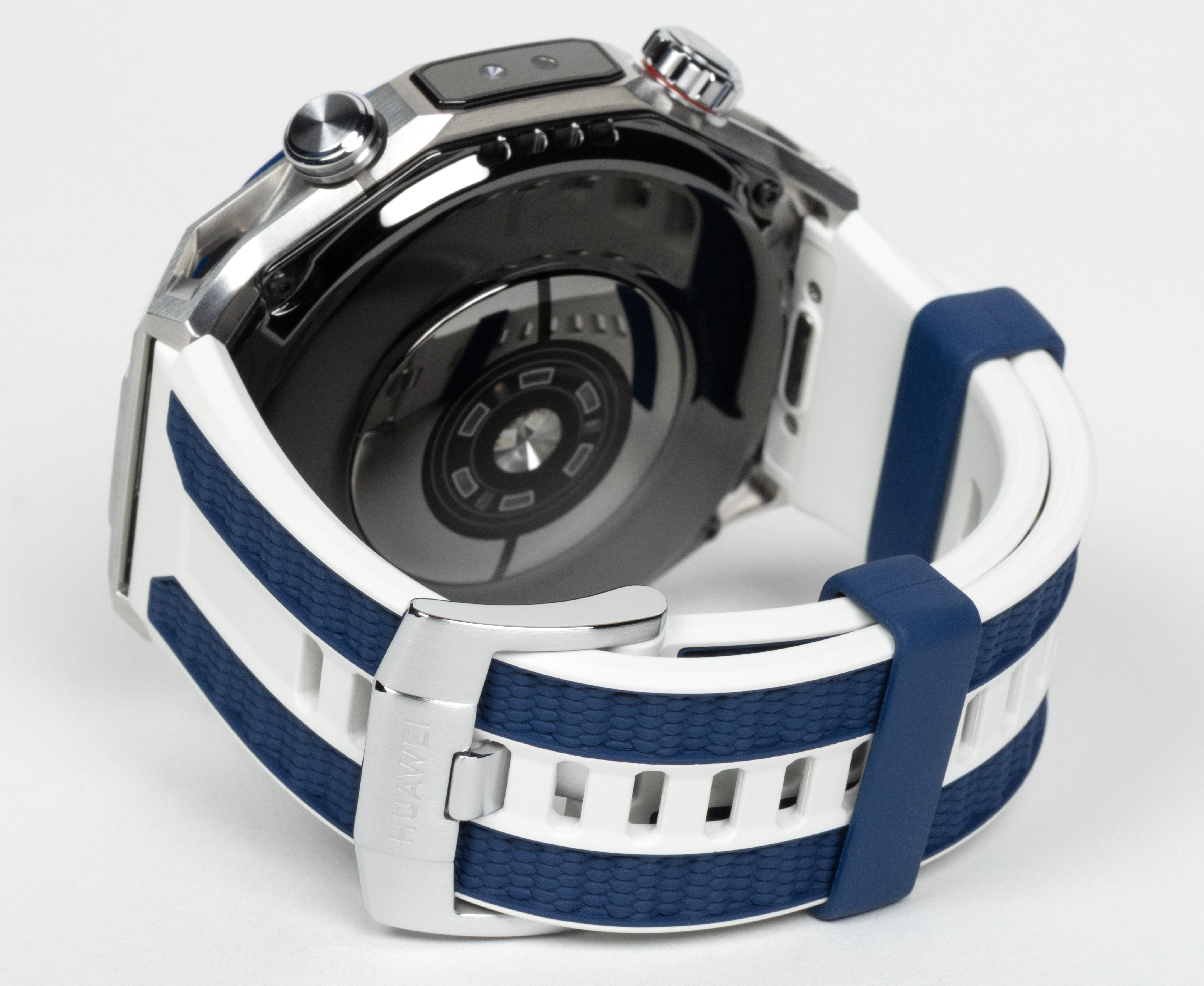 Бывает, что на фотографии гаджет выглядит прекрасно, а вживую оказывается отнюдь не столь привлекательным. В данном случае все ровно наоборот. Рекламные изображения не передают ощущений от облика этих часов. Да, они очень крупные и брутальные. Но это не спортивная брутальность, а представительская. И ключевой фактор здесь - даже не мощный восьмигранный корпус из циркониевого сплава (хотя и он выглядит очень эффектно), а широкий керамический безель. В бело-синей версии, которая у нас на тестировании, он соединяет оба этих цвета. При этом насечки и цифры на нем не просто нарисованы, но прорезаны.