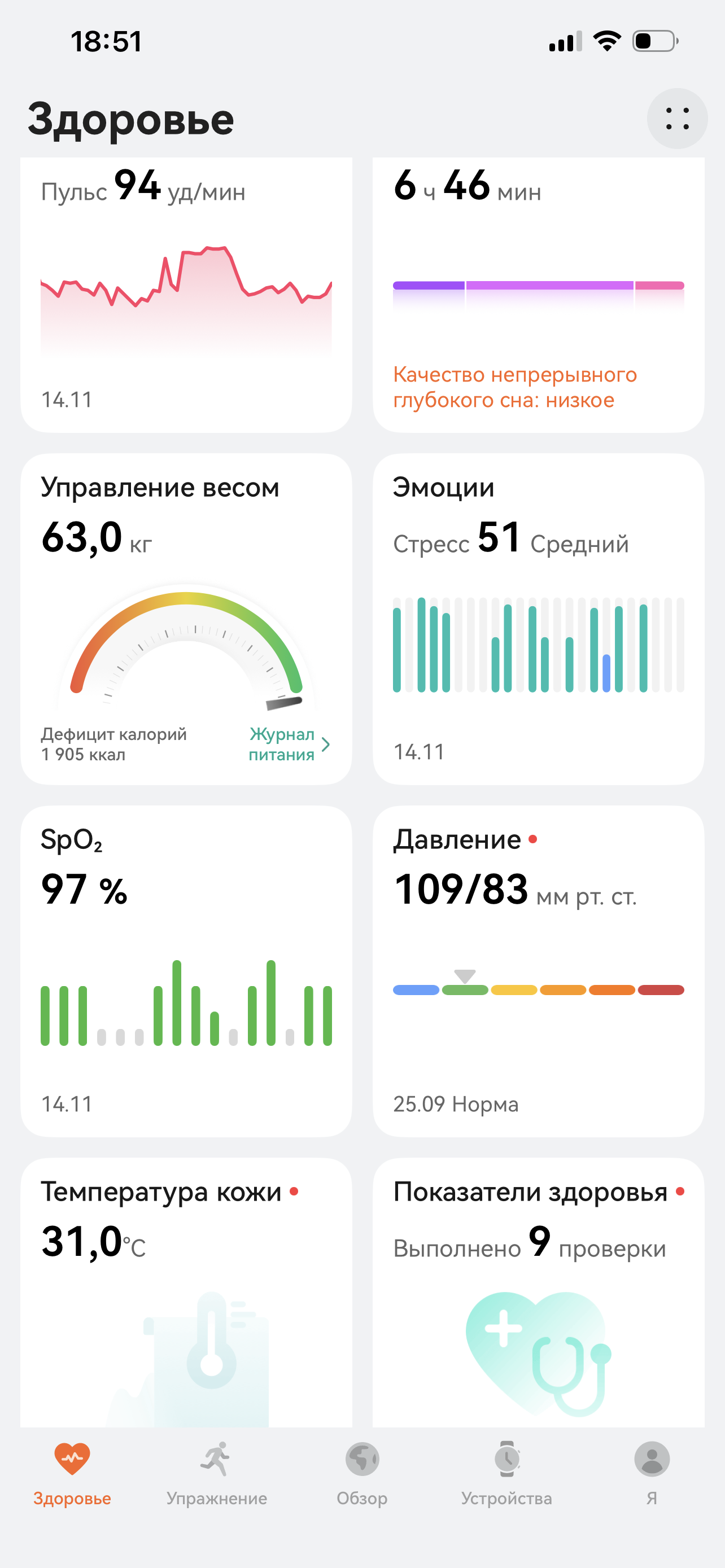 Чтобы получить самую последнюю сборку, придется несколько раз обновиться, и процесс это небыстрый (даже при подключении к Wi-Fi 6, полностью заряженных часах и смартфоне, лежащем рядом). Сложно сказать, что дает HarmonyOS 6 именно для носимых устройств. Производитель утверждает, что в целом она обеспечивает более быстрый запуск приложений (на 11%), а загрузка контента должна ускориться на 30%. Обещан также рост автономности.
