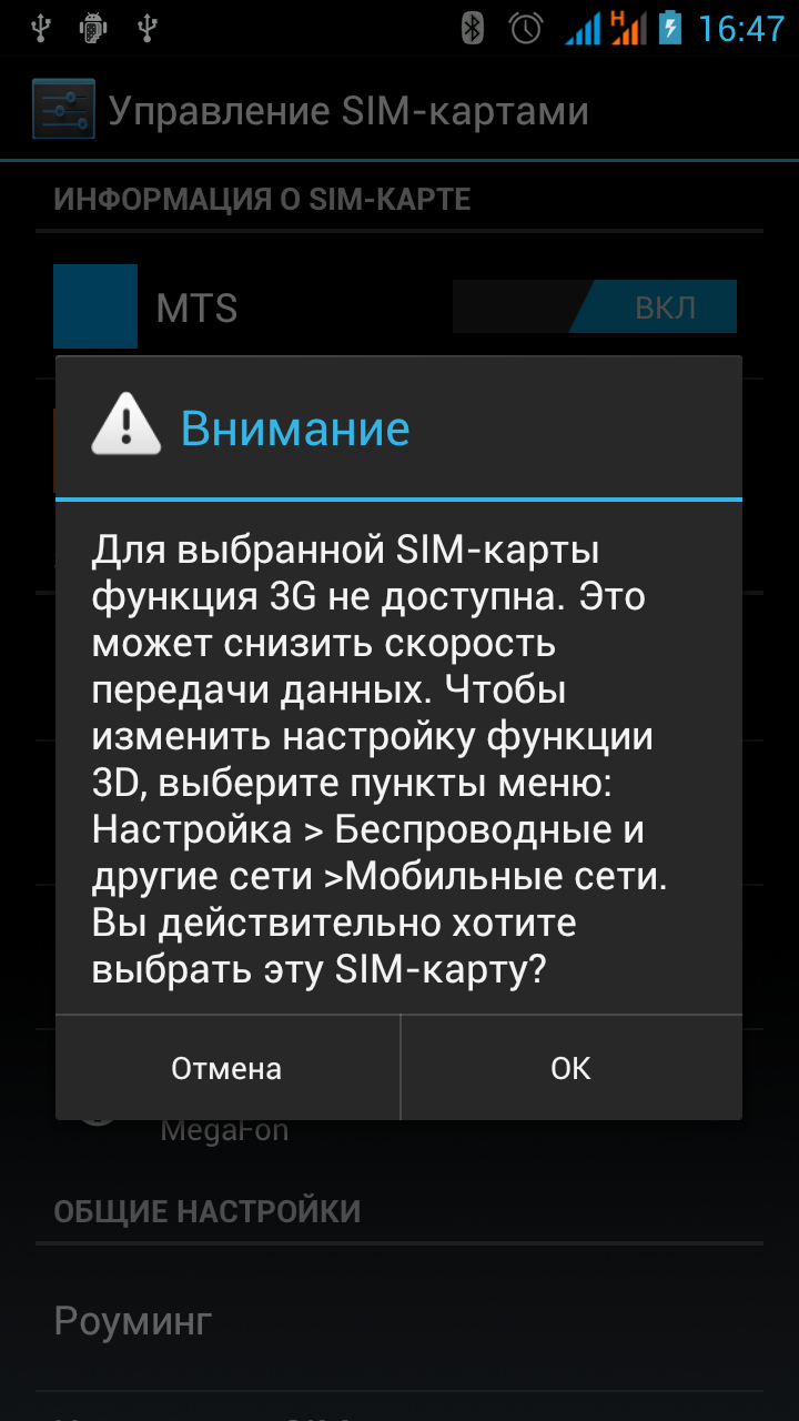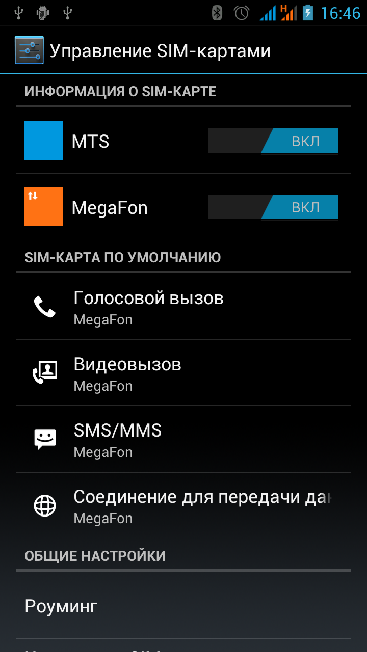 В верхней части экрана системы, в области уведомлений, находятся индикаторы сетей, которые информируют владельца смартфона, в каком режиме (2G или 3G) работают каналы сотовой связи. Как обычно, любую SIM-карту можно назначить в настройках основной для того или иного действия: передачи данных, сообщений, голосовых вызовов, либо не назначать таковой. В последнем случае система будет предлагать диалог выбора SIM-карты при совершении вышеперечисленных операций. При работе с двумя картами одного оператора разобраться, где что, помогут разные цвета и названия SIM-карт в системе.