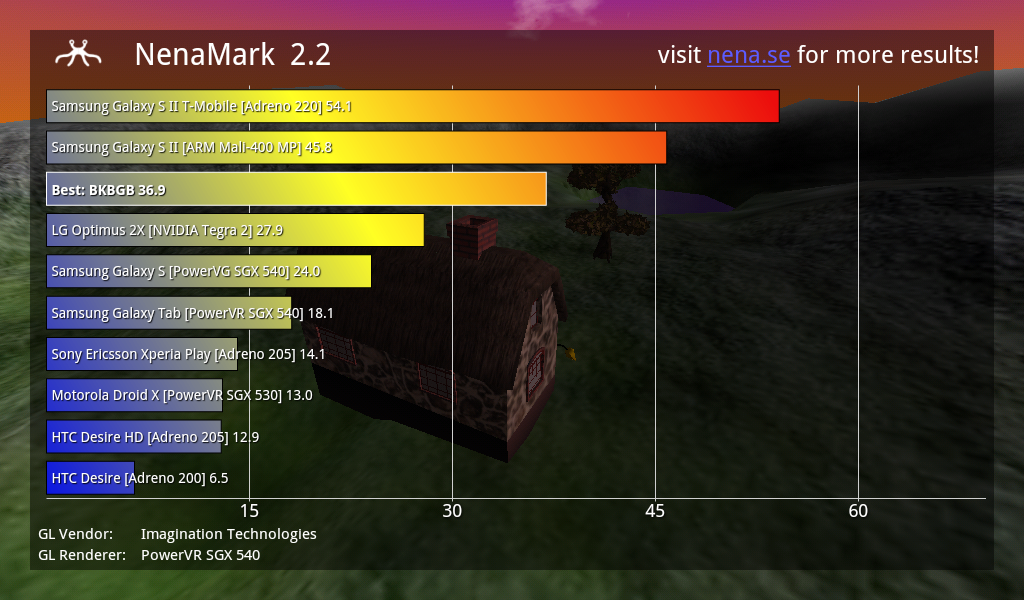 На диаграмме NenaMark нам интересно еще кое-что. Обратите внимание, что у Samsung Galaxy Tab, SoC которого включает тот же GPU, что и Medfield (PowerVR SGX540), результат в NenaMark существенно хуже. Это подтверждает слова, сказанные представителями Intel на российской презентации Medfield: в Medfield GPU работает на более высоких частотах, чем в SoC других производителей.