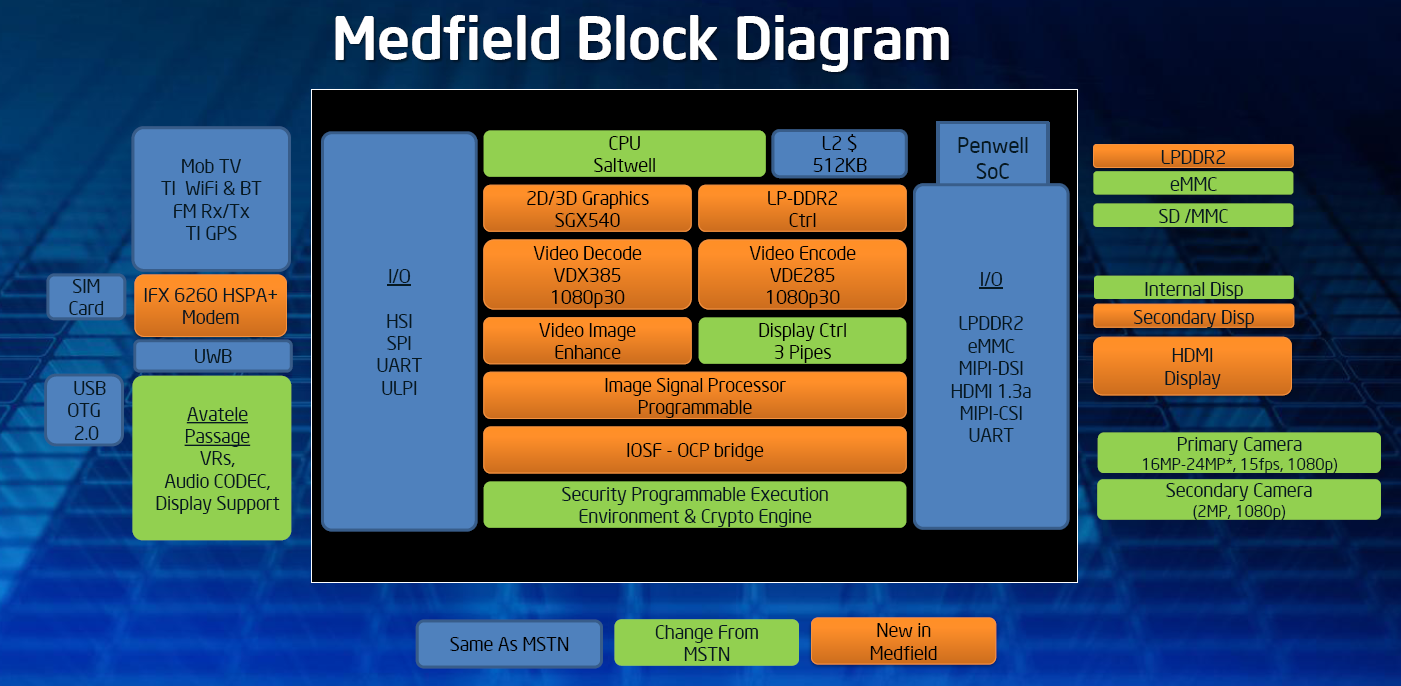 Medfield — это система на чипе, в состав которой входят процессорное ядро (а в перспективе — ядра) Intel Atom серии Z6xx (кодовое имя — Satwell) и графический ускоритель PowerVR SGX540.