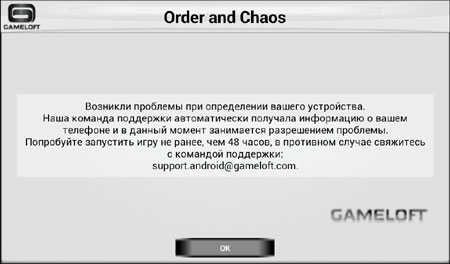 Зато после установки на Megafon Mint прошивки Android 4.0.4 нам удалось обнаружить всего несколько игр, которые были бы видны в Play Store, но после загрузки и попытки запустить их сообщали бы о своей несовместимости с нашим смартфоном. Этим исключением оказались игры Modern Combat 3: Fallen Nation и Order and Chaos (Gameloft), а также Horn (Zynga). Правда, Horn ничего не сообщает, просто не запускается. А при попытке запустить Order and Chaos появилось вот такое извещение: